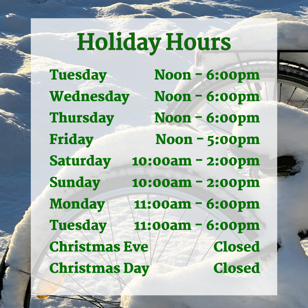 We will be closed on Friday for a family commitment. Regular hours the rest of the week. Stop in and check out our selection of holiday gifts for everyone on your list.